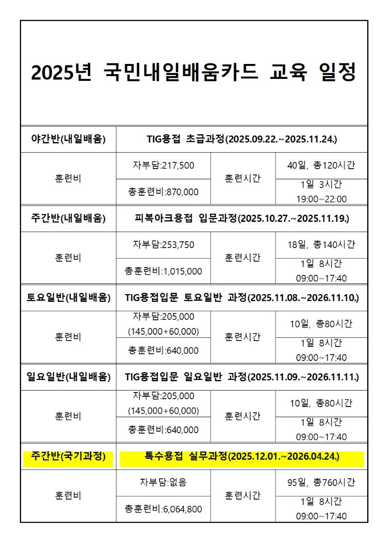 국민내일배움카드 교육생 모집 페이지 정보 작성자 관리자 댓글 0건 조회 361회 작성일 25-08-11 13:59 본문 국민내일배움카드 교육생을 모집합니다.주간반, 야간반, 주말반 등 기초부터아주 세심하게 기술지도를 하오니초보님들 망설이지 마시고 지원해 보세요~~~^^ 목록 다음글국민내일배움카드 교육생 2차 모집(야간반, 토요일반, 일요일반) 25.01.23 댓글목록 댓글목록 등록된 댓글이 없습니다.